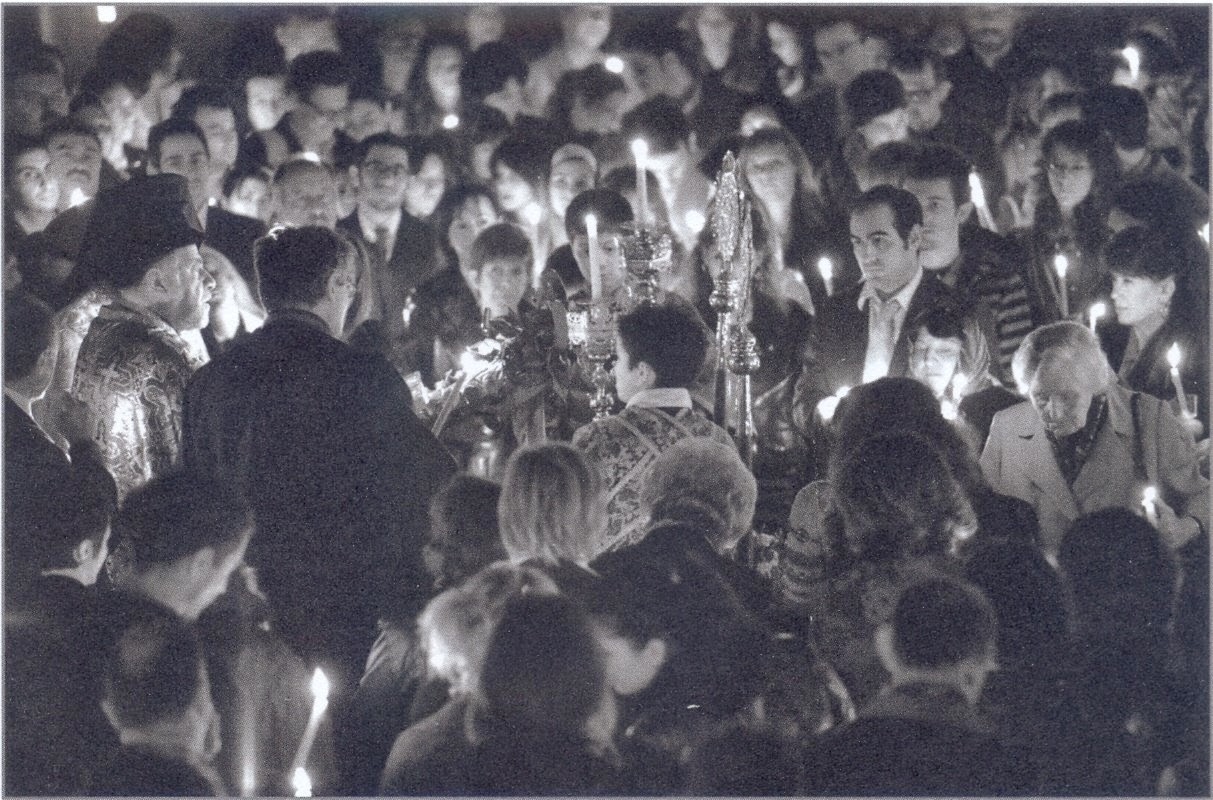 Μετά το Μπαλουκλή στην Παναγία των Βλαχερνών. Πρέπει να ψάλλω και εκεί την Ανάσταση. Το αγίασμα της Παναγίας προσελκύει χιλιάδες προσκυνητές ακόμα και από τη Ρωσία, μου είπαν. Ο ναός γεμάτος πιστούς. Ρωμιούς, αραβόφωνους Ορθοδόξους και προσκυνητές από την Ελλάδα. Λειτουργεί ο Επίσκοπος Συνάδων Διονύσιος, μαζί με τους δυο ιερείς της περιφερείας του Φαναρίου που είναι υπεύθυνος. Ψάλλω και εδώ χωρίς μικρόφωνο. Δεν υπολογίζεις όμως την κούραση της φωνής και τη γενικότερη σωματική κόπωση όταν ζεις στιγμές μοναδικές! Η τελετή της Αναστάσεως έγινε στο προαύλιο του ναού με τους πιστούς να ψάλλουν το «Χριστός Ανέστη» με όλη τη δύναμη της ψυχής τους. Επιτέλους, σκέφτηκα, ένα Πάσχα χωρίς πυροτεχνήματα και ρυπαντικά μεγάφωνα. Εδώ κυριαρχεί η φυσικότητα. Τελειώνουμε την Λειτουργία στις 2 μετά τα μεσάνυχτα. Στην Πόλη δεν βιάζονται να τελειώσουν την Αναστάσιμη Λειτουργία όπως στην Ελλάδα. Μετά τη Λειτουργία δεν φεύγουν τρέχοντας για να πάνε να φάνε. Πήγαμε στην κοινοτική αίθουσα, παραπλεύρως του ναού, και πήραμε πρωινό. Τσουγκρίσαμε τα κόκκινα αυγά, ανταλλάξαμε ευχές από καρδιάς, οι παλιότεροι μας μίλησαν για Πάσχα στην Πόλη αλλοτινών καιρών. Μια όντως αναστάσιμη ατμόσφαιρα.